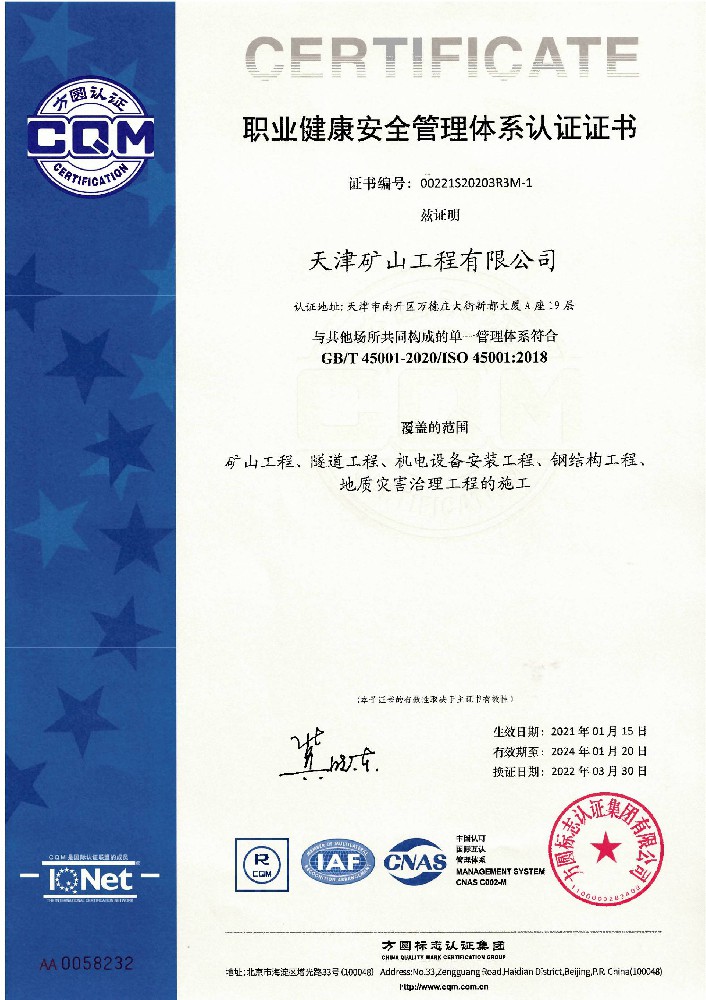 職業(yè)健康安全管理體系認證證書